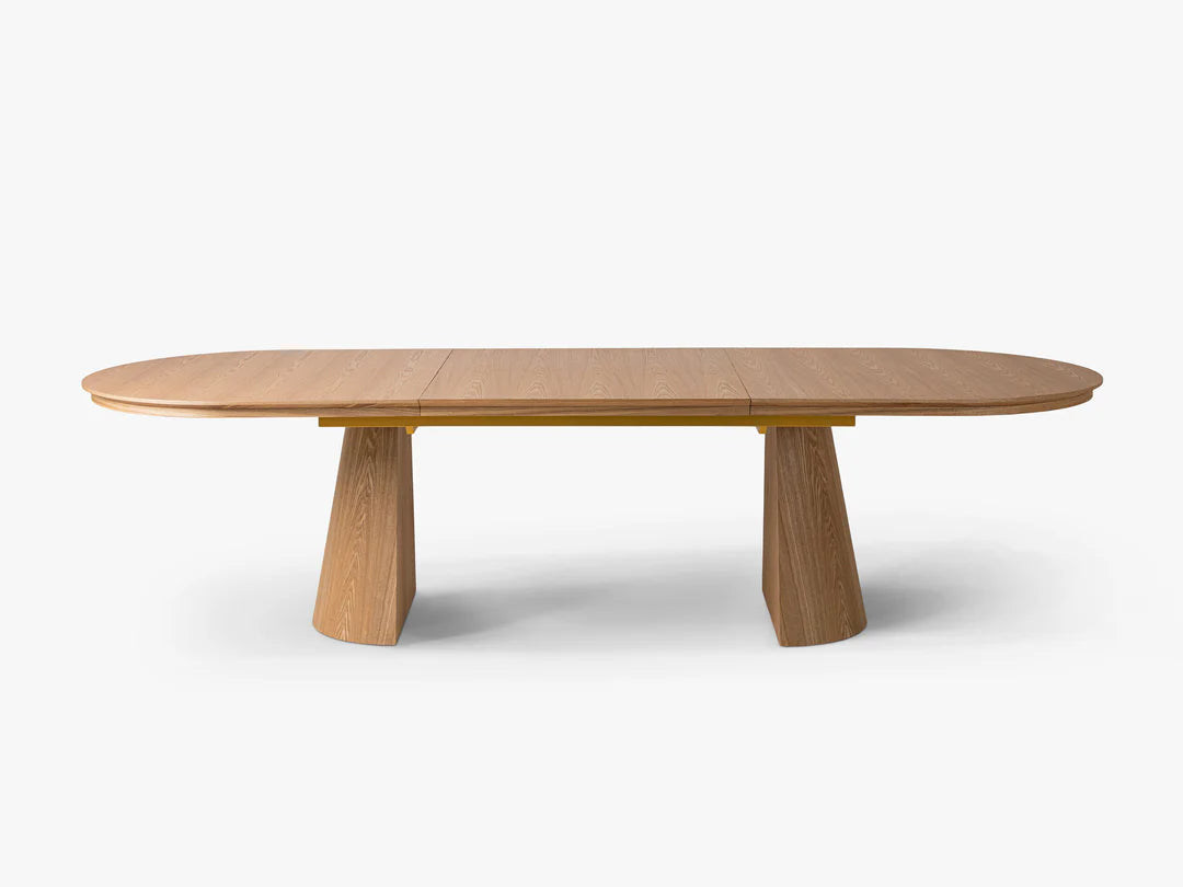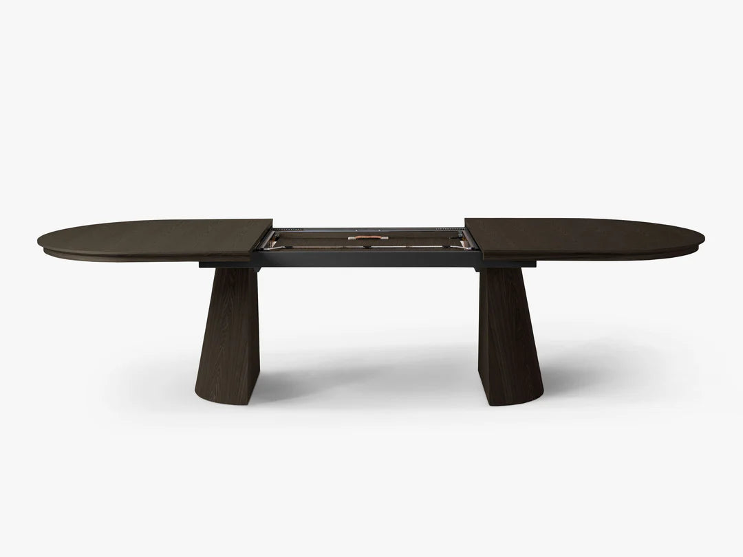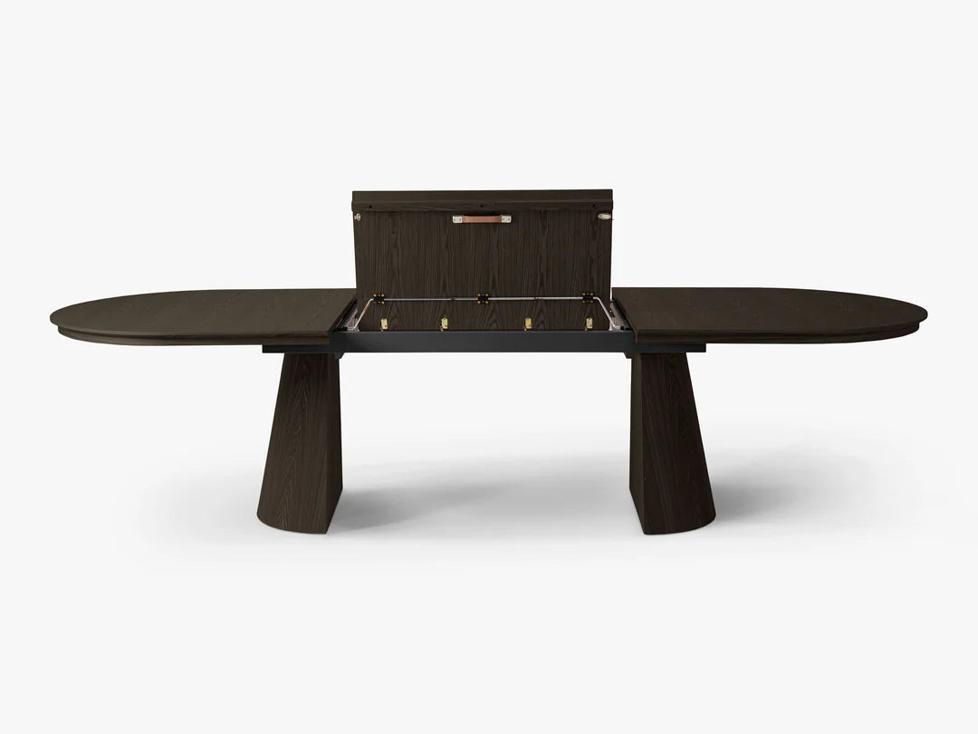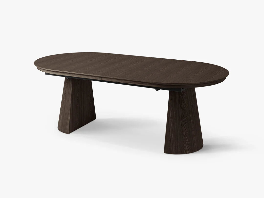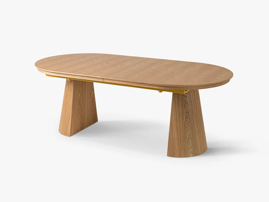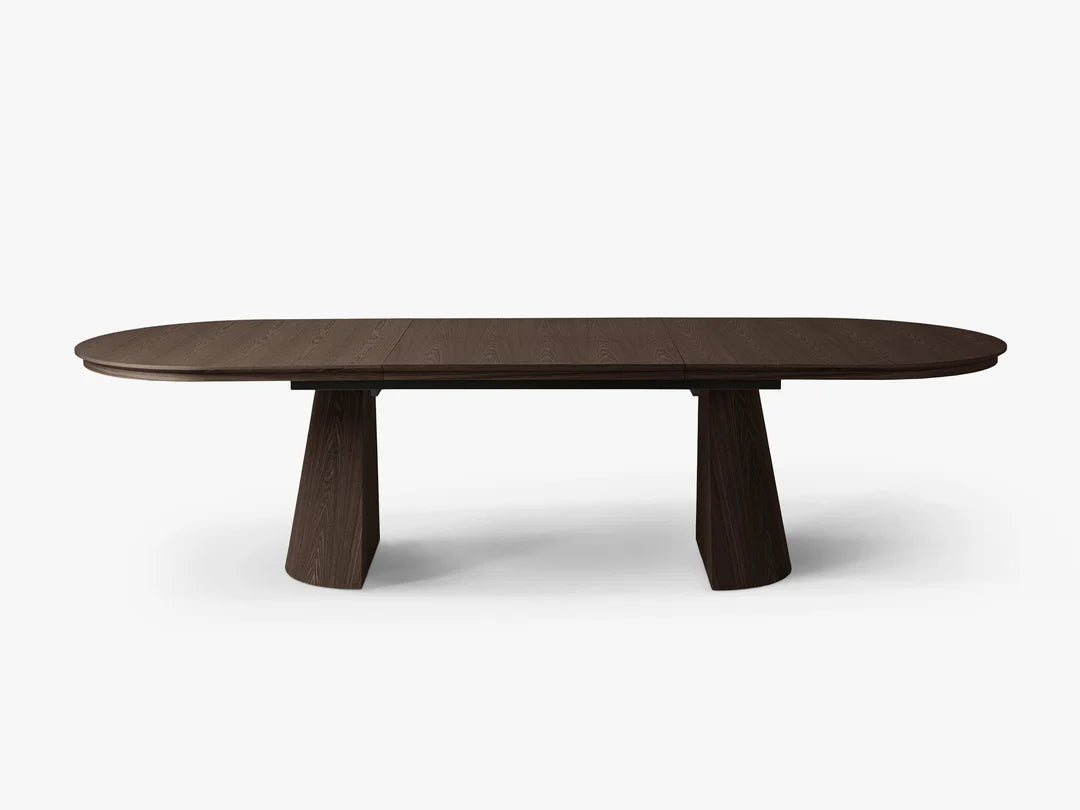Bordet kan enkelt utvides fra 210 til 300 cm, noe som gjør det ideelt for både hverdagsbruk og større sammenkomster. Den solide konstruksjonen med to karakteristiske ben gir stabilitet og et stilrent uttrykk.